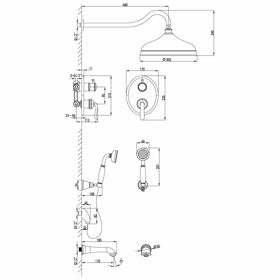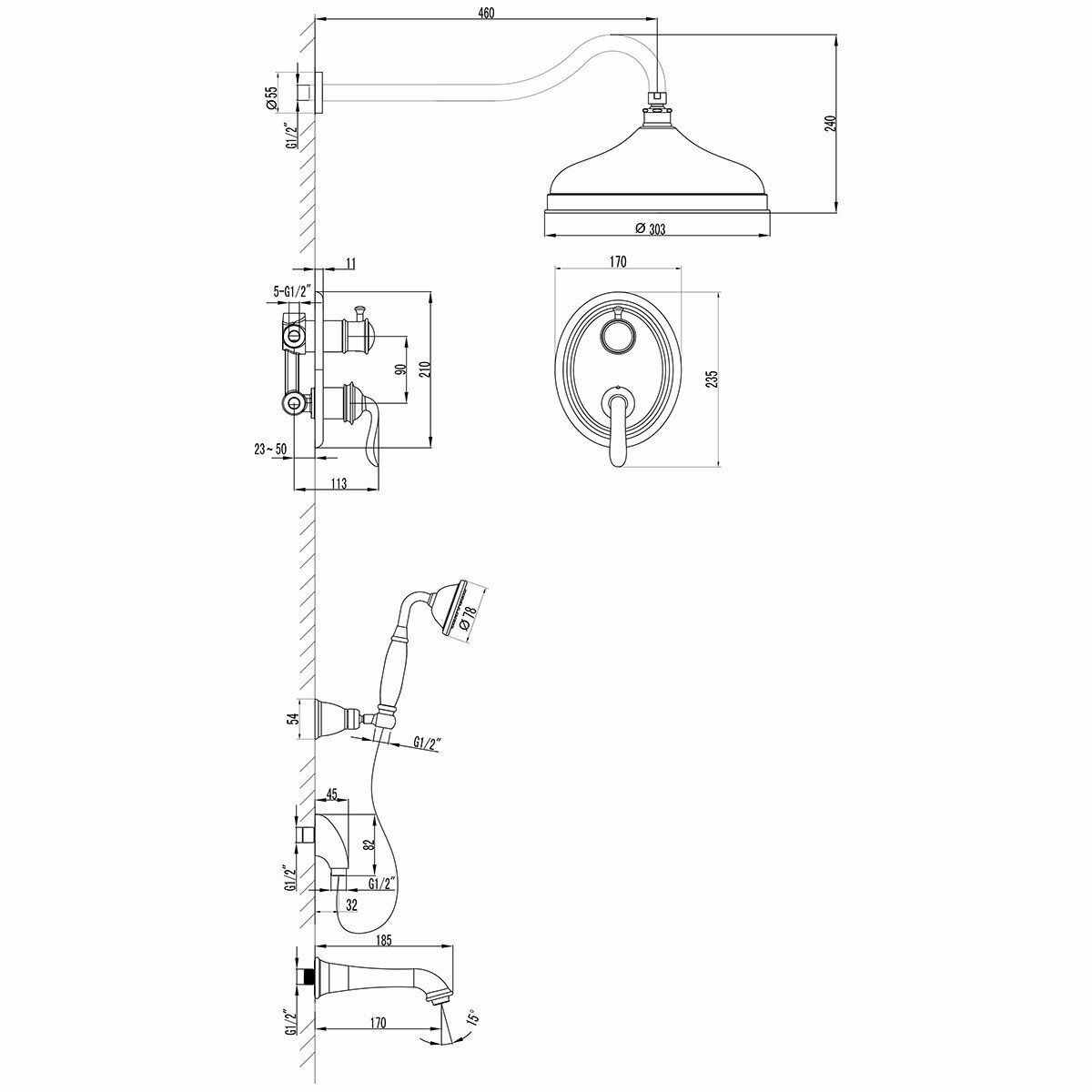 | Дополнительная информация | диаметр душевой лейки: 66 мм; диаметр верхнего душа: 303 мм |