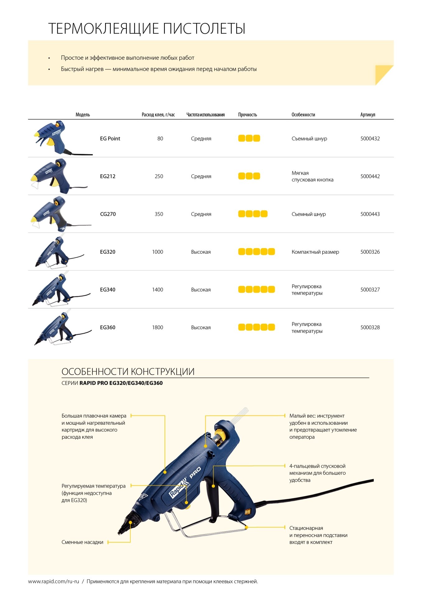 СохранитьRAPID PRO EG360 термоклеящий пистолет d12 мм, 300 Вт, регулировка температуры 120-230 °С расход 1800 г/ч , время нагрева 1 мин 5000328 интересное: