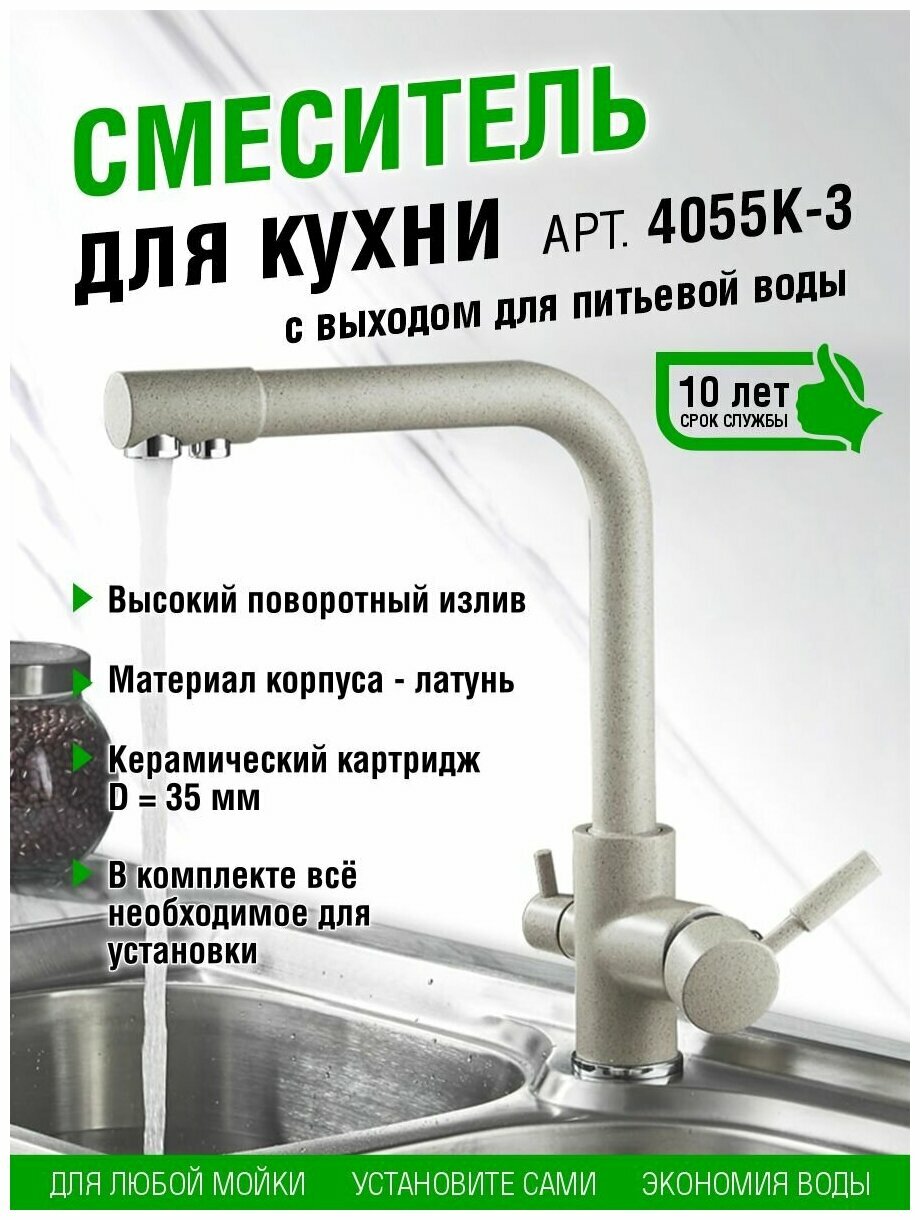 Смеситель для кухня с выходом питьевой воды LEDEME картридж диаметр 35 мм, бежевый-матовый L4055K-3 807025
