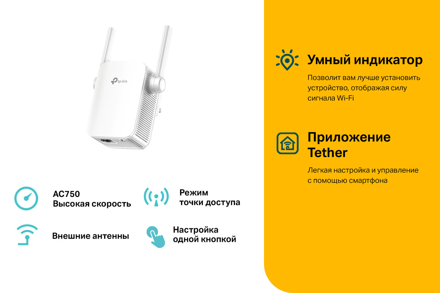 Wi-Fi маршрутизатор TP-Link RE205 AC750 до 433 Мбит/с на 5 ГГц + до 300 Мбит/с на 2,4 ГГц, поддержка .
