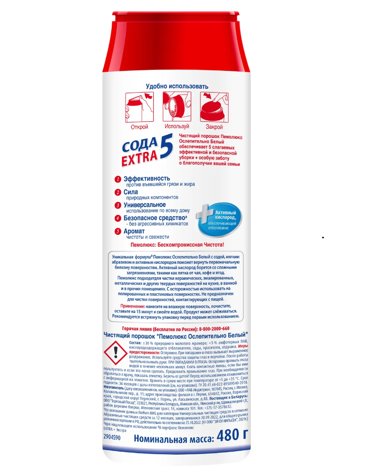 Средство чистящее Пемолюкс "Сода 5 Extra. Ослепительно белый", порошок, 480г (арт. 235535)