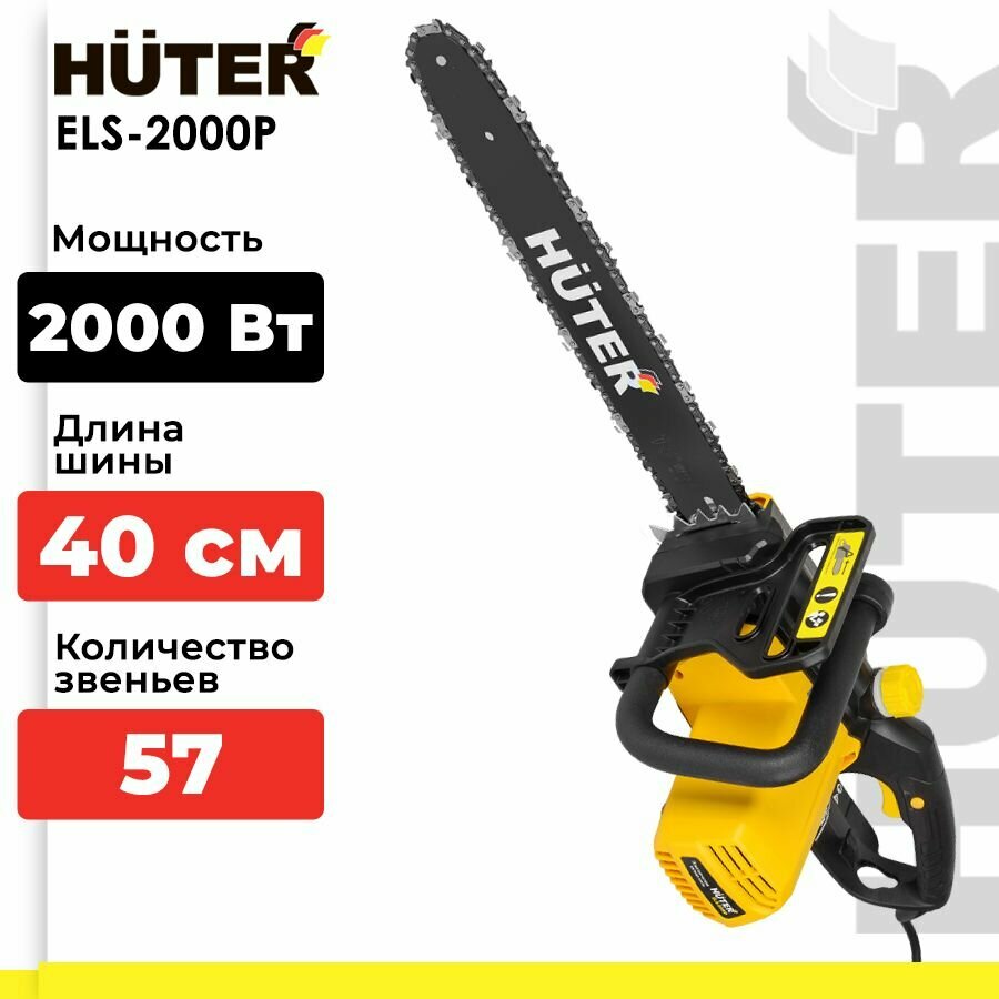 Электропила HUTER ELS-2000P, 2000 Вт, скорость пиления 13,6 м/с, шина - 40 см, шаг цепи - 3/8", тормоз цепи
