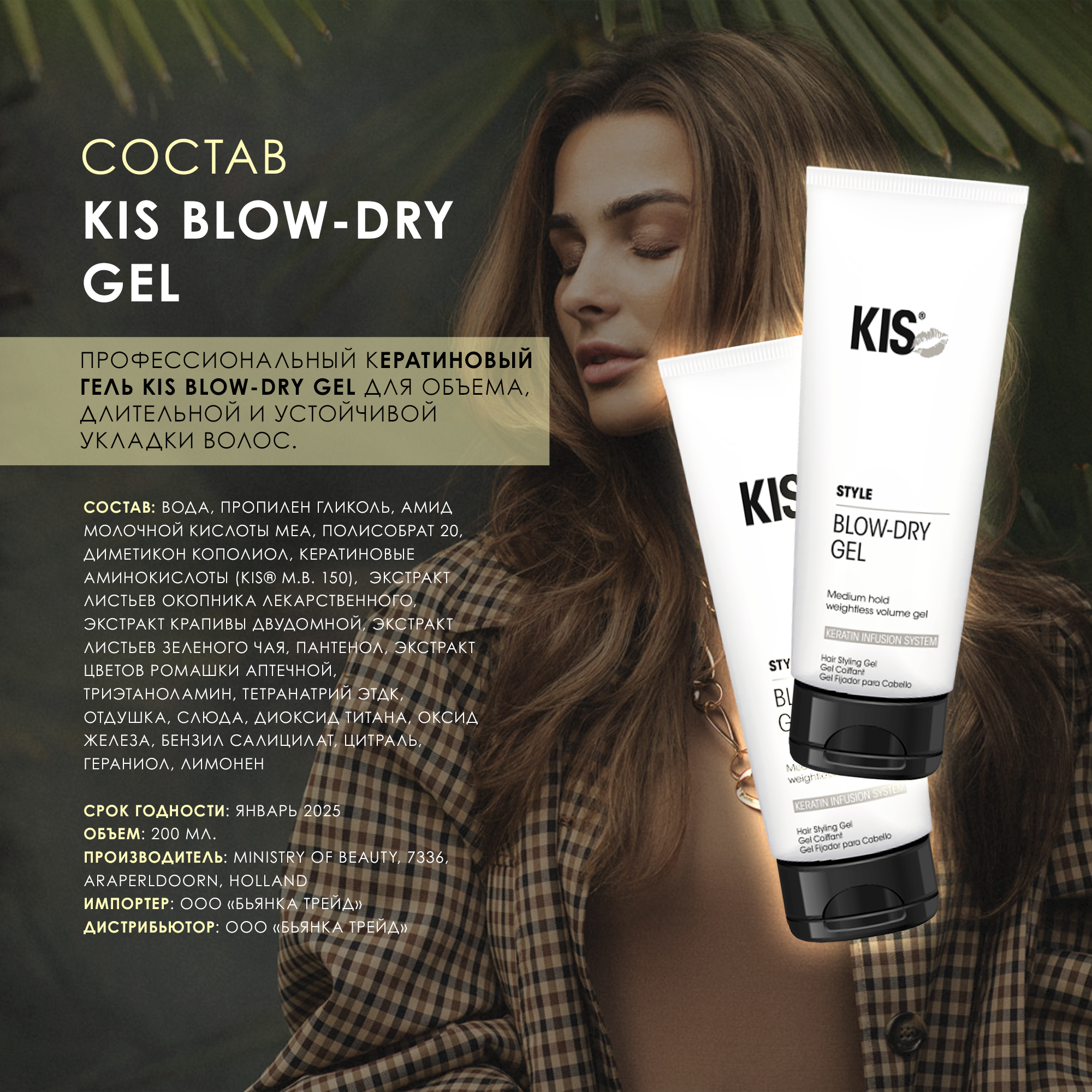 KIS Blow-Dry Гель профессиональный для объема кератиновый длительной и устойчивой укладки волос, 200 мл