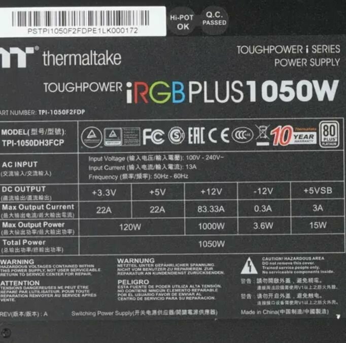Ниже Вы можете прочитать отзывы на Блок питания Thermaltake Toughpower iRGB Plus 1050W 80+ Platinum PS-TPI-1050F2FDPE-1, ознакомится с подробными характеристиками, посмотреть интересные обзоры и фотографии на Блок питания Thermaltake Toughpower iRGB Plus 1050W 80+ Platinum PS-TPI-1050F2FDPE-1.