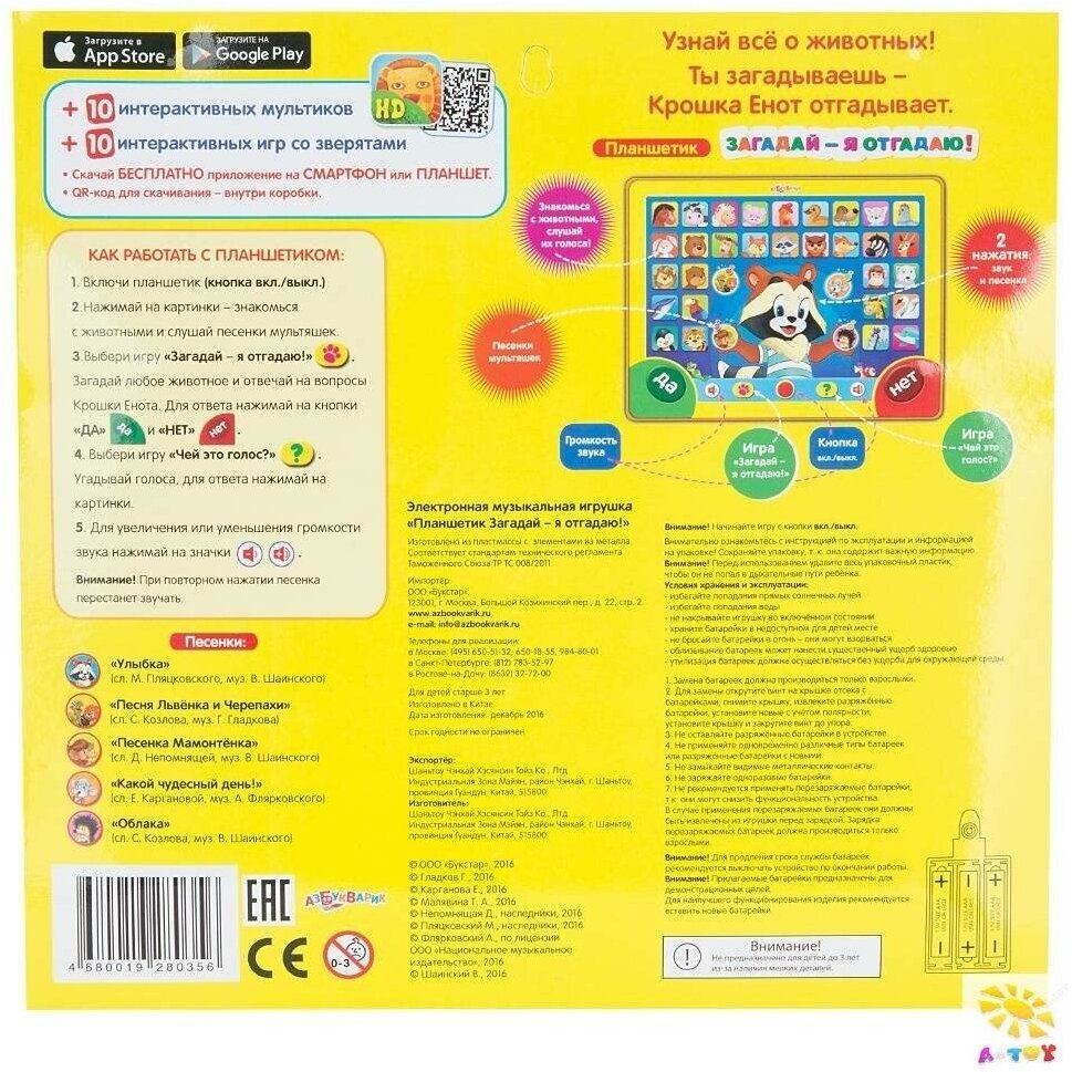 | Плюсы: | Учит ребенка животным. Платшет у нас уже лет 5 и вс? ещё хорошо работает. Ребенок и кидал и ходил по нему. И вс? цело |