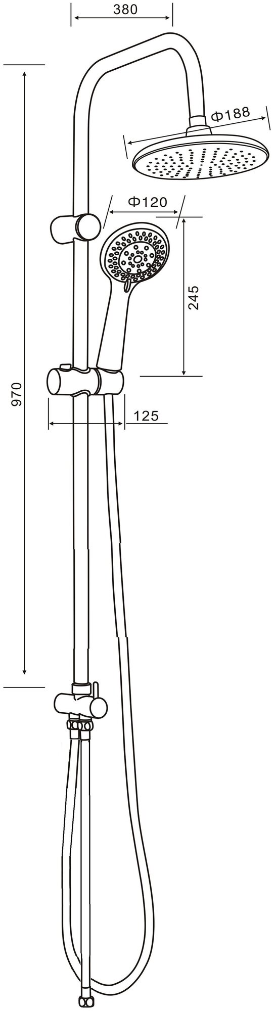 | Дополнительная информация | высота стойки для душа: 970 мм; диаметр душевой лейки: 120 мм; диаметр верхнего душа: 188 мм |