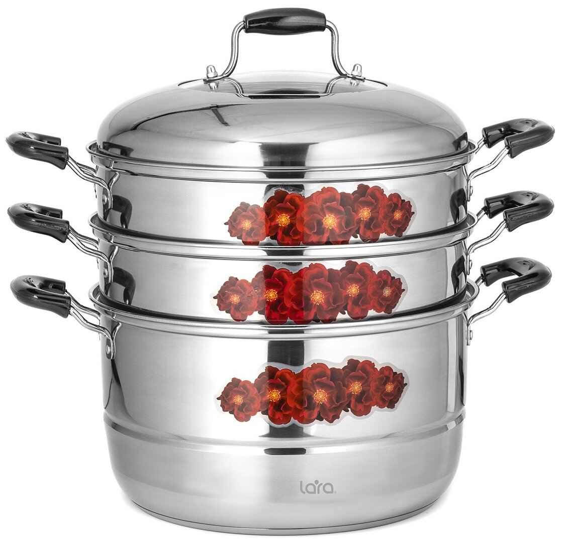 LR03-40 Мантоварка-пароварка LARA (нерж) 28x31см, 11л, 3 секции + крышка с окном, сталь 0,5 мм