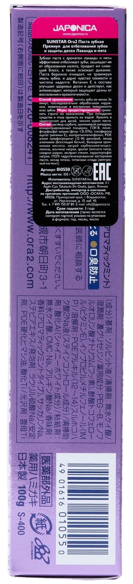 SUNSTAR Ora2 Premium Японская отбеливающая зубная паста, укрепление эмали, защита от кариеса, без SLS и карбоната кальция, мятно-лавандовый вкус, 100 гр.