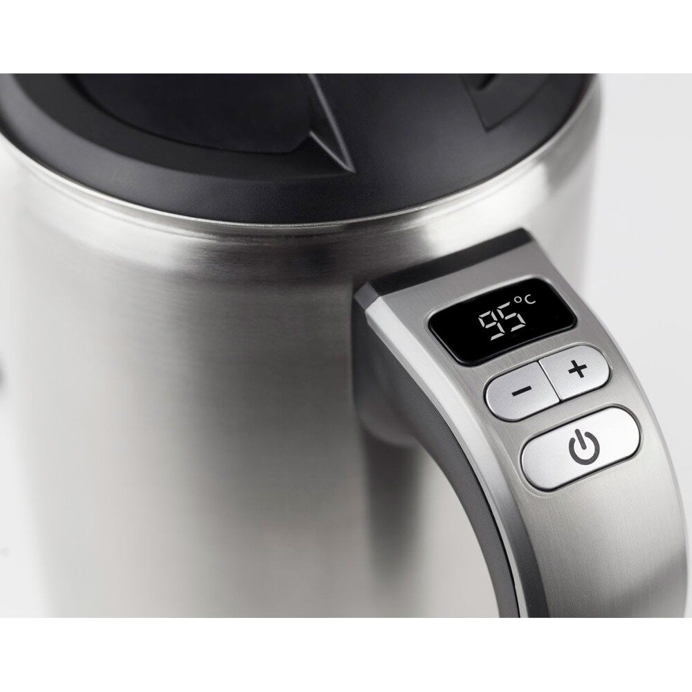 | Плюсы: | Двойные металлические стенки в виде термоса, о внешние стенки не обжечься и дольше держит тепло. Крышка снизу металлическая. Возможность задания температуры. Отображение температуры в процессе нагревания. Поддержание температуры 90гр в течение часа, если чайник не поднят после кипения. Звуковой сигнал после достижения температуры. |