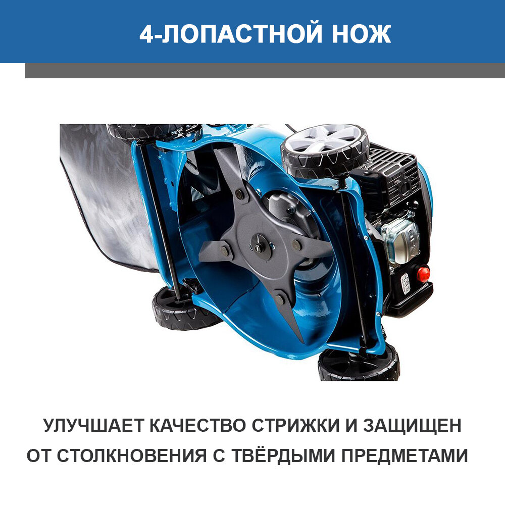 Ножи спорной формы. Когда забивается косилка, они начинают вибрировать и издавать настораживающие звуки. Заводится очень не легко, нужно прилагать усилия - жена не может завести сама. Искал с функцией мульчирования, вроде бы она тут есть, но на самом деле мульчирование плохое.