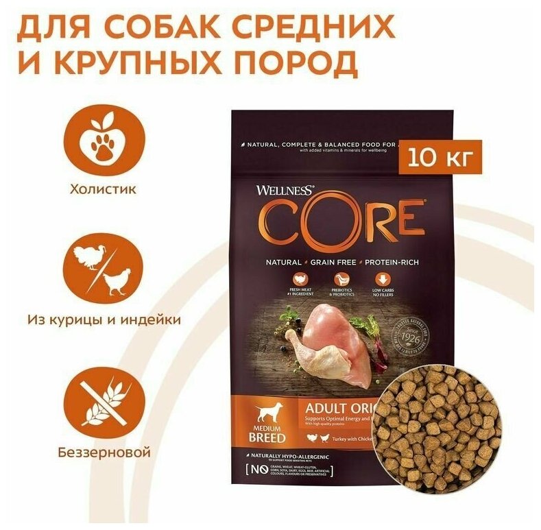 Сухой корм для собак Wellness CORE Original, беззерновой, индейка, курица 10 кг (для средних пород)
