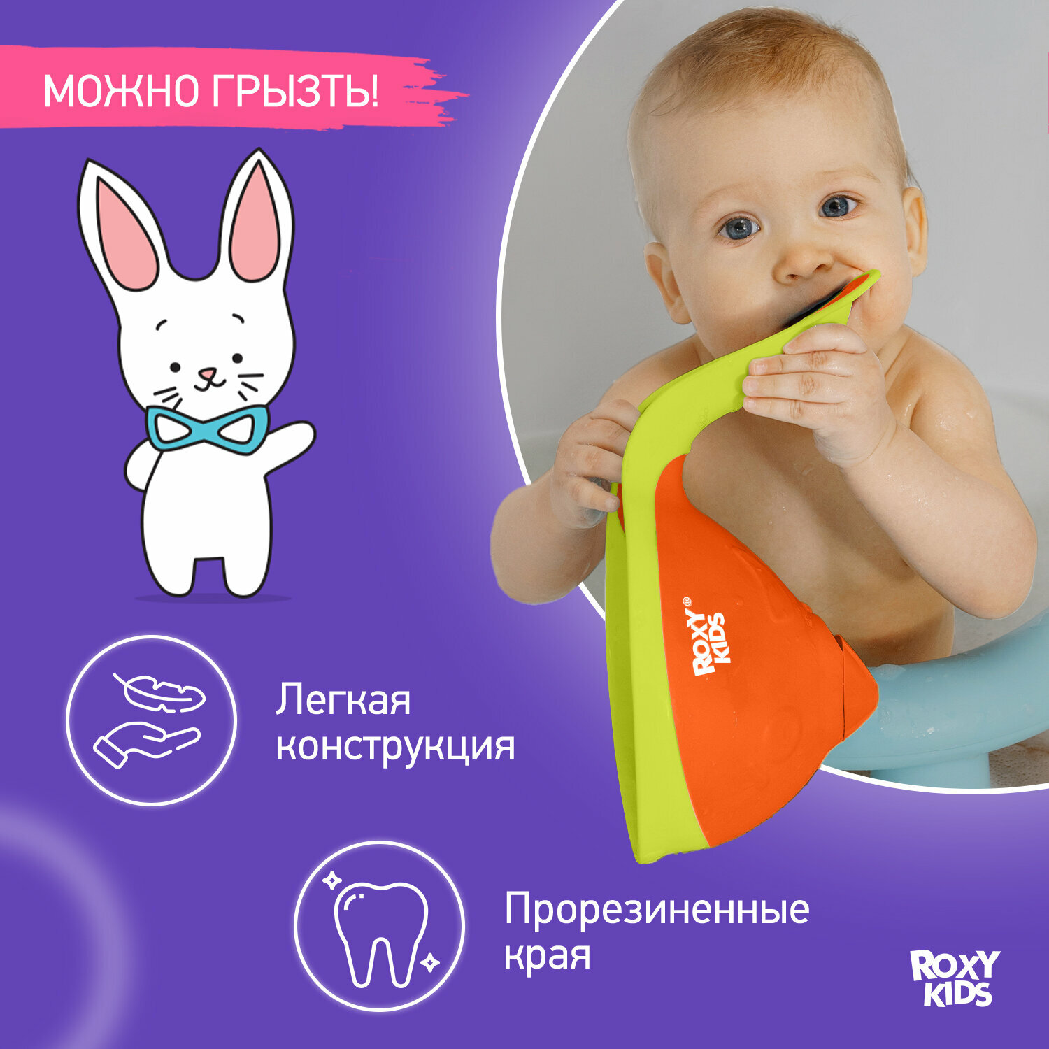 | Плюсы: | Яркий, силиконовые края, удобная ручка, можно использовать как игрушку |