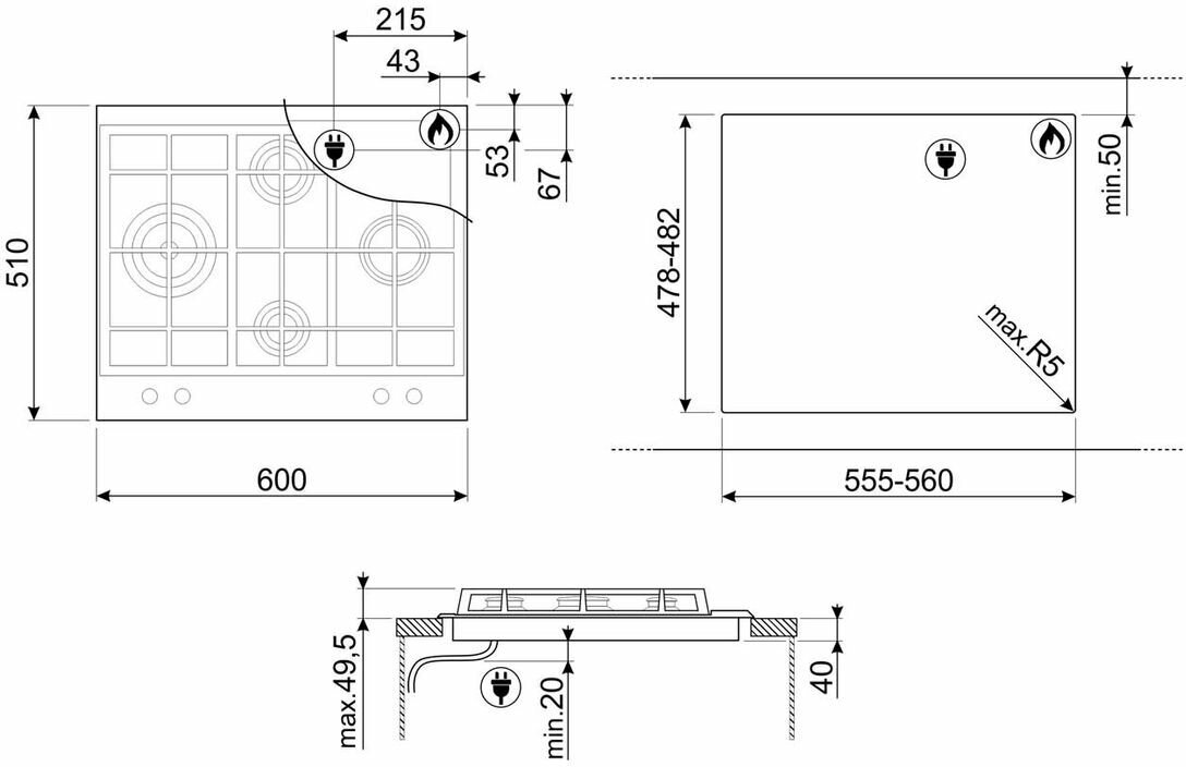 Встраиваемая газовая панель SMEG/ Газ, Linea,газовая варочная панель, 60 см,нержавеющая сталь