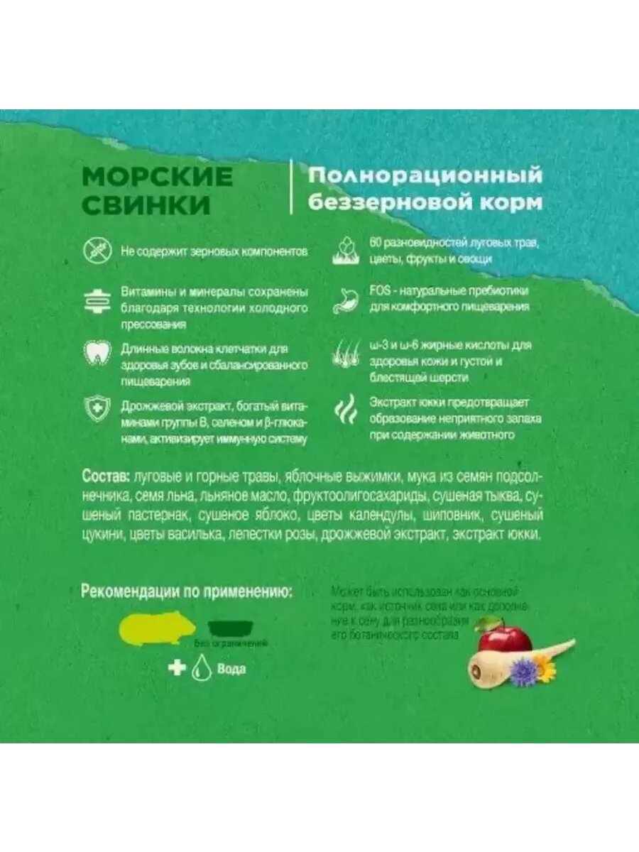 Во первый в нем 60 видов полезных трав Во вторых множество овощей и фруктов И в третьих этот корм полезен для пищеварения и здоровья морской свинки. Однозначно 5 балов ? |