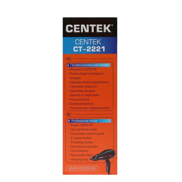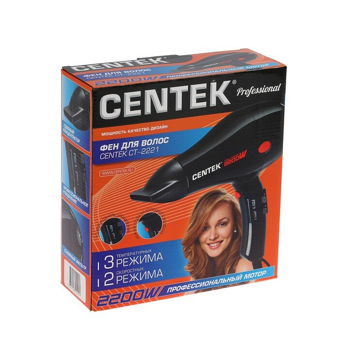 Ниже Вы можете прочитать отзывы на Centek Фен Centek CT-2221 Professional, 2200 Вт, 2 скорости, 3 температурных режима, чёрный, ознакомится с подробными характеристиками, посмотреть интересные обзоры и фотографии на Centek Фен Centek CT-2221 Professional, 2200 Вт, 2 скорости, 3 температурных режима, чёрный.