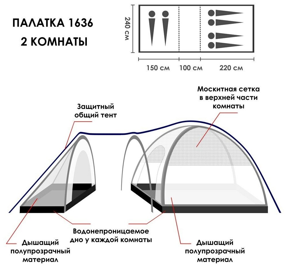 | Отзыв: | Приобрели палатку в надежде, что она действительно большая, и в нее поместится 6 человек. По прибытию в лес обнаружили, что возможно, китайцы имели ввиду людей ростом 130 см и весом 40 кг.