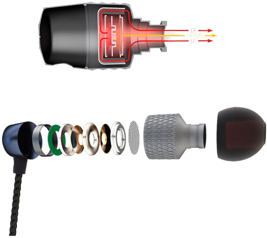 Качество звучания Отличная сборка Отличные материалы, алюминевый корпус Два динамических драйвера! Точнее, с технической точки зрения, драйвер один, но в нем две мембраны, 8 и 10 мм, передняя отвечает за средние и высокие частоты, а задняя за басы. Провод жесткий, не склонен к спутыванию, выглядет очень надежно Прямой джек (для меня+) 3 пары насадок +1 пара на наушниках |