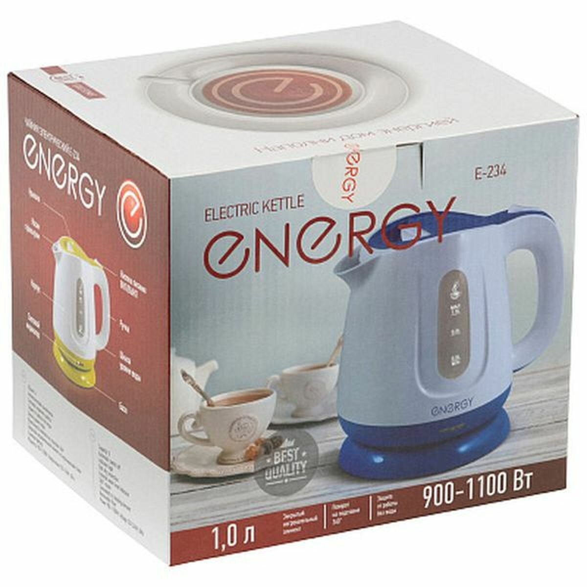 Energy E-234 чайник электрический дисковый, 1.0л, 1100Вт, пластиковый, шкала уровня воды, синий