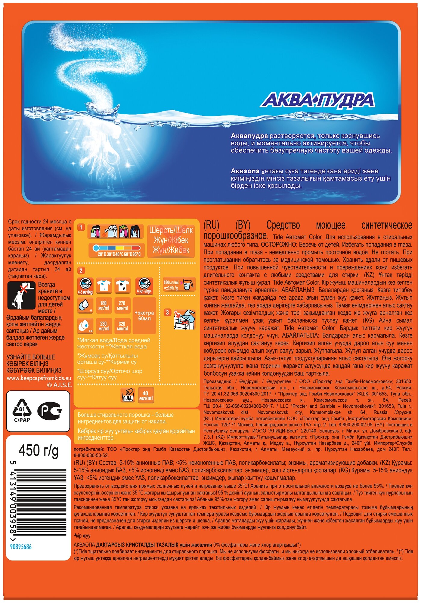 Купить Стиральный порошок Tide Аквапудра Color, автомат, для цветного белья, 450 г