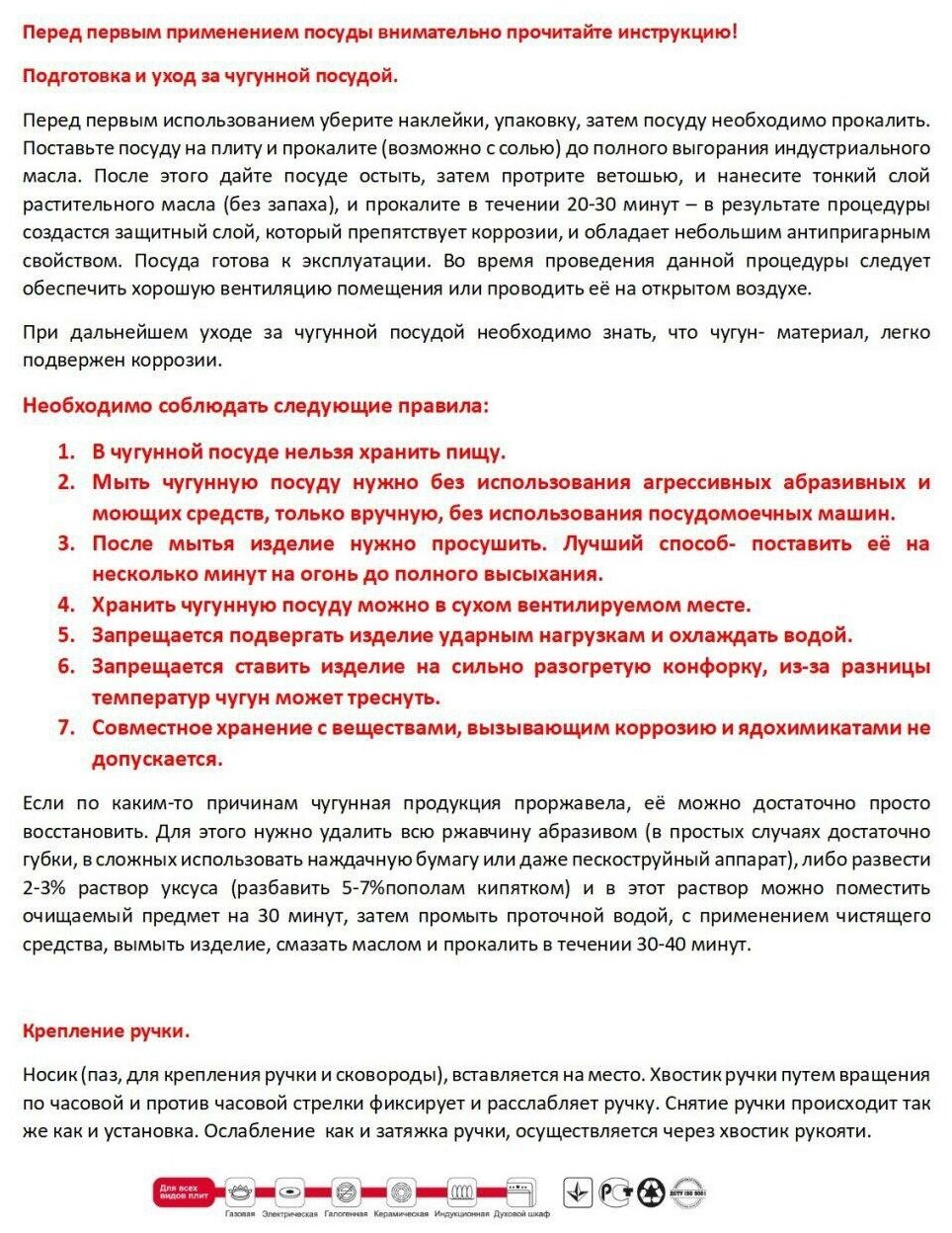 | Минусы: | Чугунная (!!) сковородка лопнула на третий день использования прямо на плите. Треснула от места прикрепления ручки до середины основания.