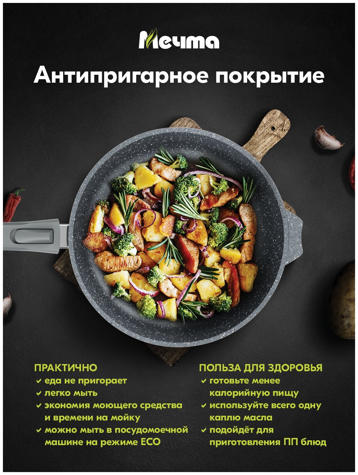 Сковорода Мечта Сковорода Мечта 22см Гранит с антипригарным покрытием со съемной ручкой 022806, диаметр 22 см