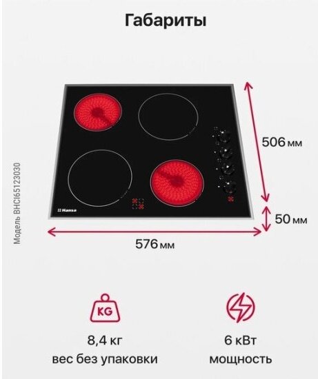 Электрическая варочная панель Hansa BHCI65123030, встраиваемая, автоматическое отключение, стеклокерамика с механическим управлением