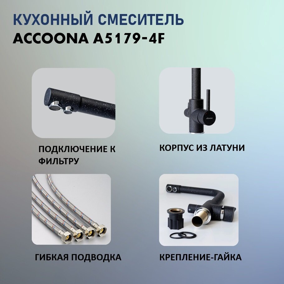 Смеситель для кухни Accoona A5179-4F, с выходом для питьевой воды, латунь, цвет черный (1 шт.)
