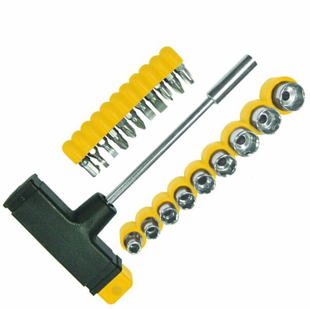 Отвертка Т-образная с набором бит и торцевых головок Biber 85553, 20 предм., желтый/черный
