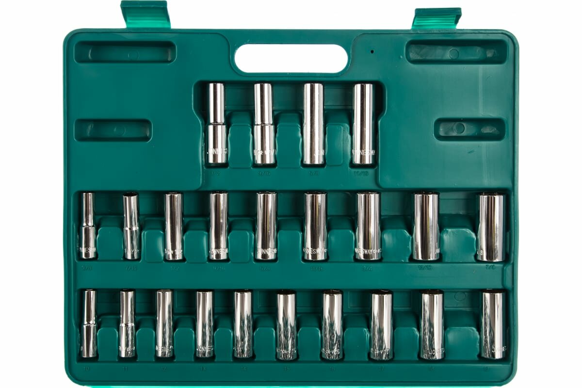 | Головки торцевые подробно | 1/4": 4, 5, 6, 7, 8, 9, 10, 11, 12, 13 мм; длинные 1/4": 4, 5, 6, 7, 8, 9, 10, 11 мм; 1/4": 5/32", 3/16", 7/32", 1/4", 9/32", 5/16", 11/32", 3/8", 7/16", 1/2"; длинные 1/4": 3/16", 7/32", 1/4", 9/32", 5/16", 11/32", 3/8", 7/16"; трещетка 1/4"; удлинитель 1/4": 75 мм; 3/8": 10, 11, 12, 13, 14, 15, 16, 17, 18, 19 мм; длинные 3/8": 10, 11, 12, 13, 14, 15, 16, 17, 18, 19 мм; 3/8": 3/8", 7/16", 1/2", 9/16", 5/8", 11/16", 3/4", 13/16"; длинные 3/8": 7/16", 1/2", 9/16", 5/8", 11/16", 3/4", 13/16", 7/8"; трещетка 3/8"; свечные 3/8": 5/8", 13/16"; удлинитель 3/8": 75 мм; 1/2" (12-гр): 18, 19, 20, 21, 22 мм; 1/2" (12-гр): 1/2", 9/16", 5/8", 11/16", 3/4", 13/16", 7/8", 15/16"; длинные 1/2": 1/2", 9/16", 5/8", 11/16"; удлинитель 1/2": 75 мм |