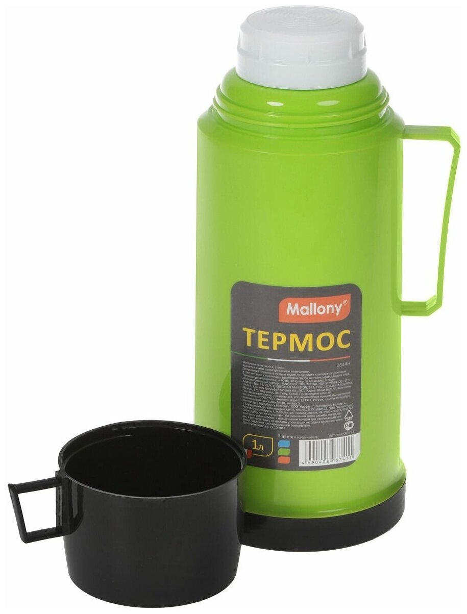 Термос Mallony / Мэллони 2644H с узким горлом пластиковый корпус колба из стекла зеленый 1000мл / термопосуда