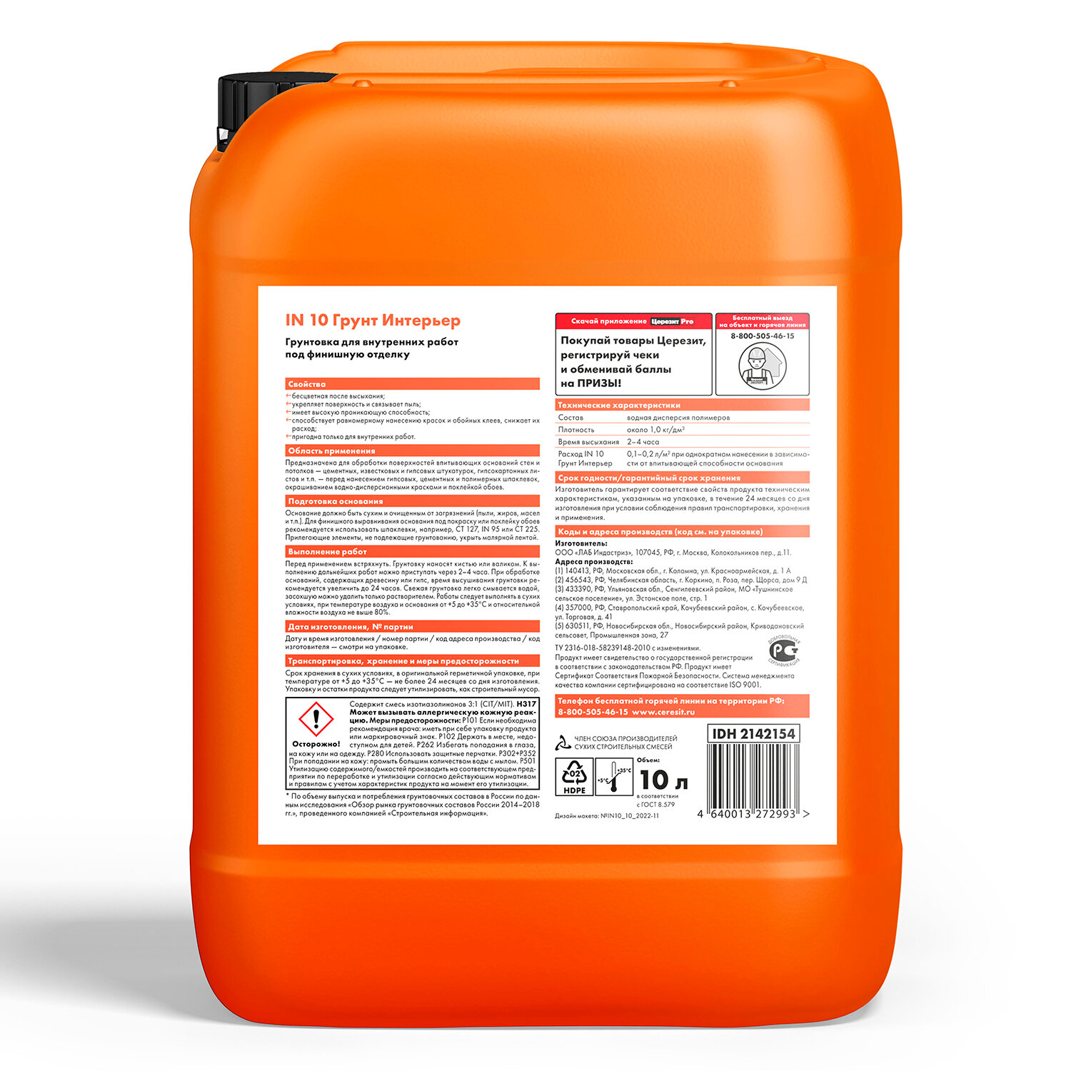 Грунтовка для внутренних работ IN 10 от бренда Ceresit объемом 10 литров