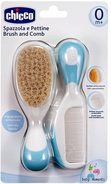 Набор CHICCO Набор детская расческа и щётка с натуральными щетинками, голубая, 0мес.+