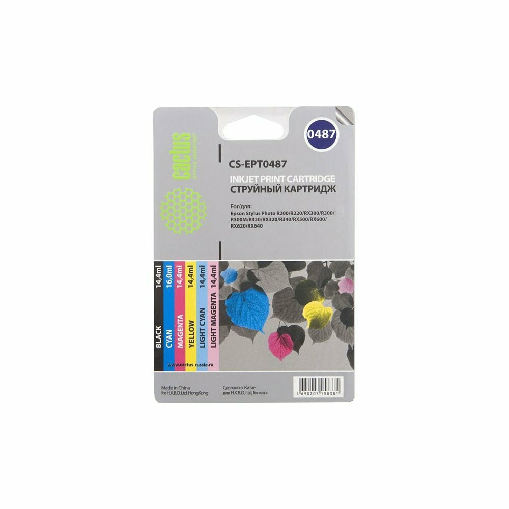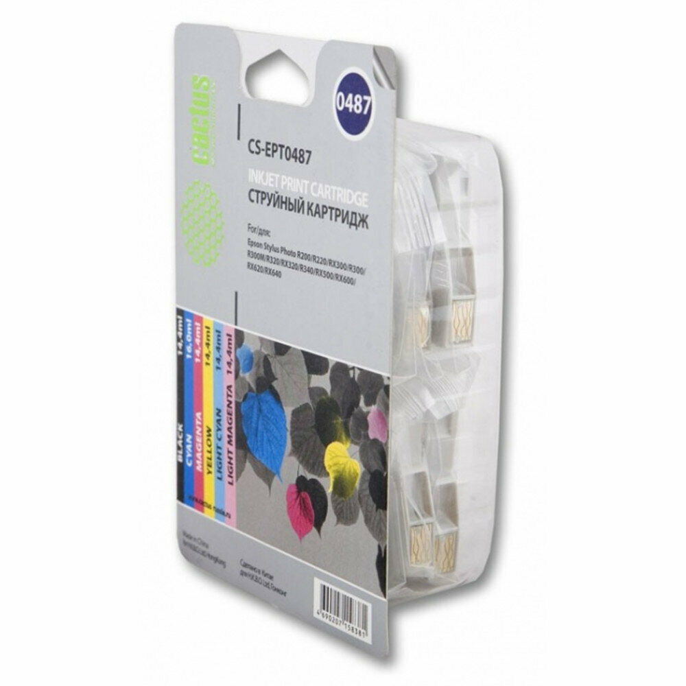 Картридж Cactus CS-EPT0487 T0487 черный/голубой/пурпурный/желтый/светло-голубой/светло-пурпурный (по 14.4 мл) для Epson R200, R220, R300ME, R320, R340, RX500, RX600, RX620, RX640, струйные