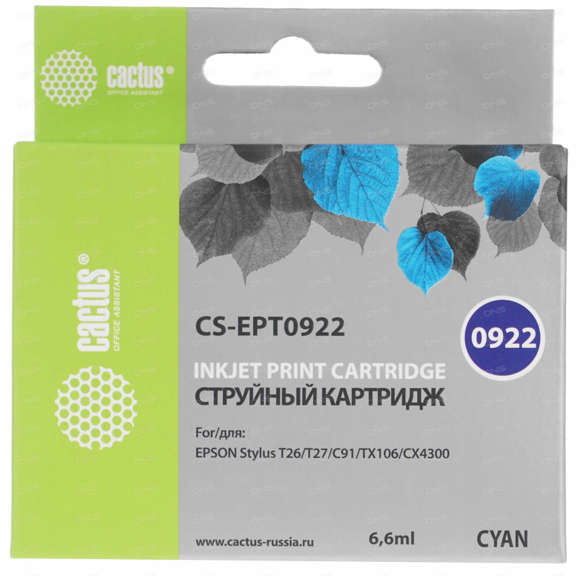 Купить Картридж струйный Cactus CS-EPT0922 T0922 голубой (6.6мл) для Epson Stylus C91/CX4300/T26/T27/TX106/TX109/TX117/TX119