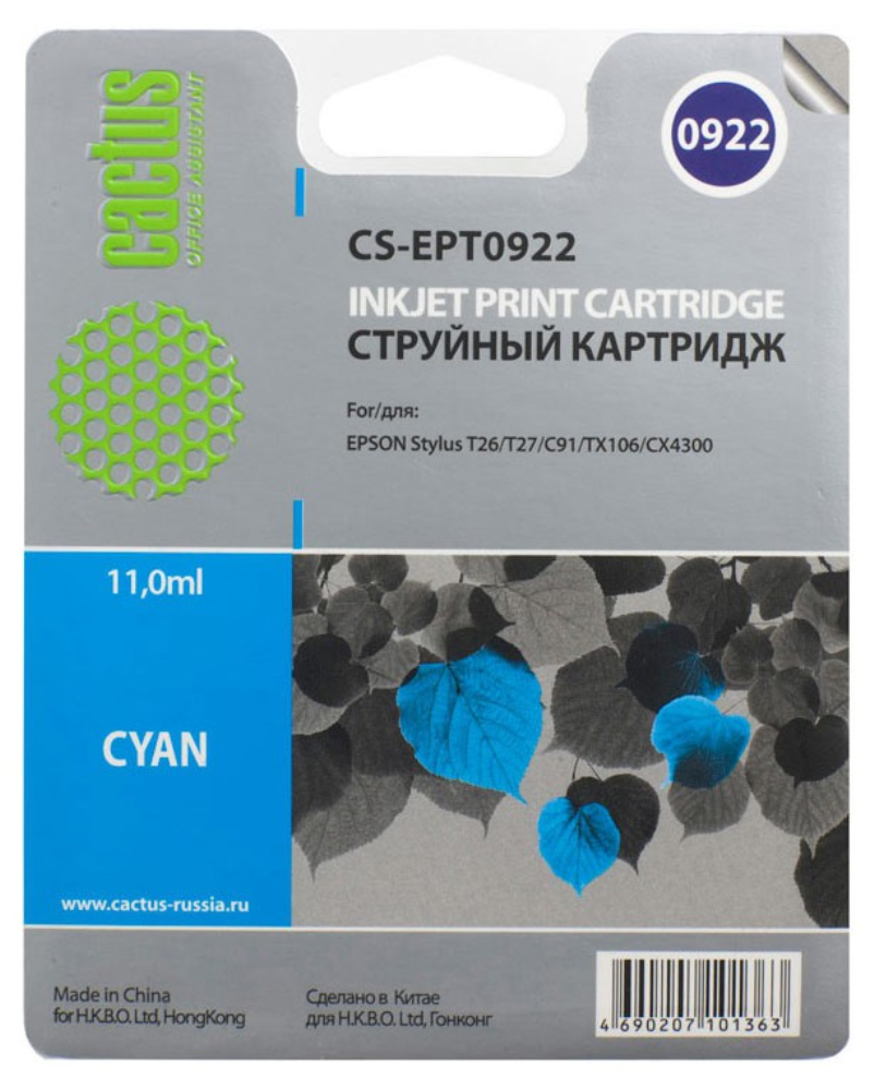Картридж струйный CACTUS (CS-EPT0922) для EPSON Stylus C91/CX4300/T26/T27/TX106, голубой