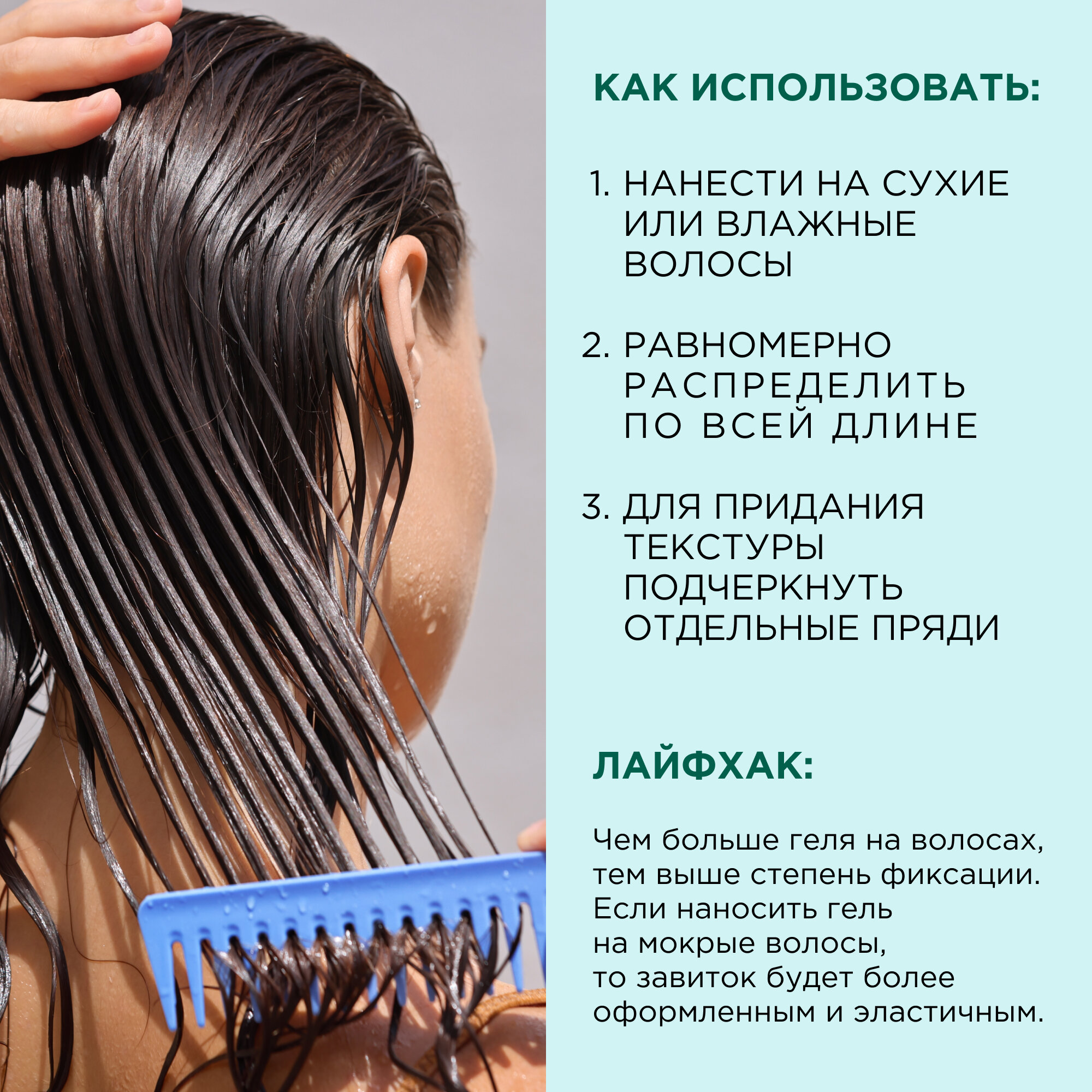 | Способ применения | Небольшое количество геля нанести на сухие или влажные волосы. Равномерно распределить от корней по всей длине волос, придавая желаемую форму. Для создания структурного эффекта гель наносится на отдельные пряди. |