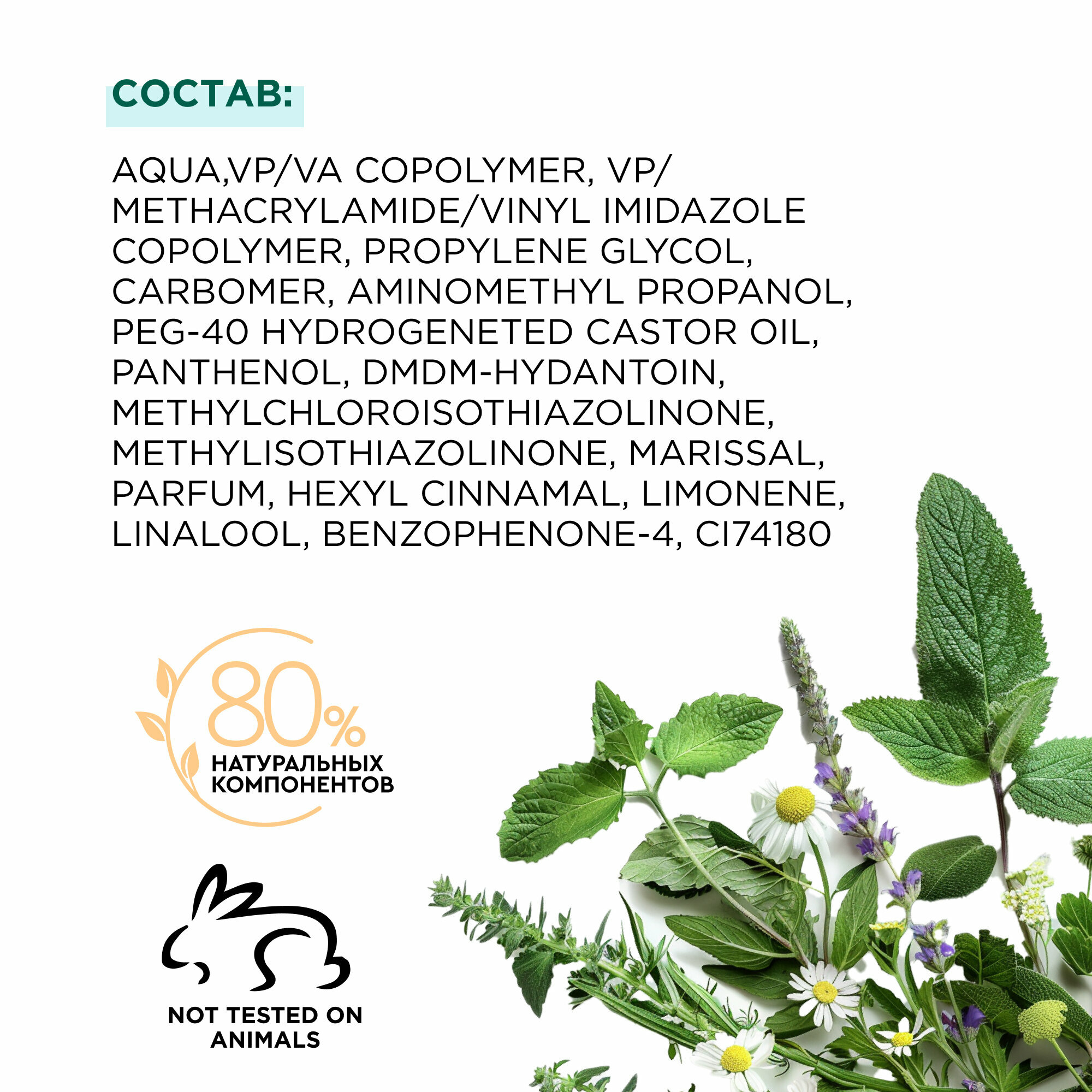 | Состав | Aqua,VP/VACopolymer,VP/Methacrylamide/VinylImidazoleCopolymer,PropyleneGlycol,Carbomer,AminomethylPropanol,PEG-40HydrogenetedCastorOil,Panthenol,DMDM-Hydantoin,Methylchloroisothiazolinone,Methylisothiazolinone,Marissal,Parfum,HexylCinnamal,Limonene,Linalool,Benzophenone-4,CI74180 |