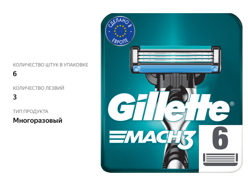 GILLETTE Mach 3 Сменные кассеты для бритья с 3 лезвиями, мужские, 6 шт