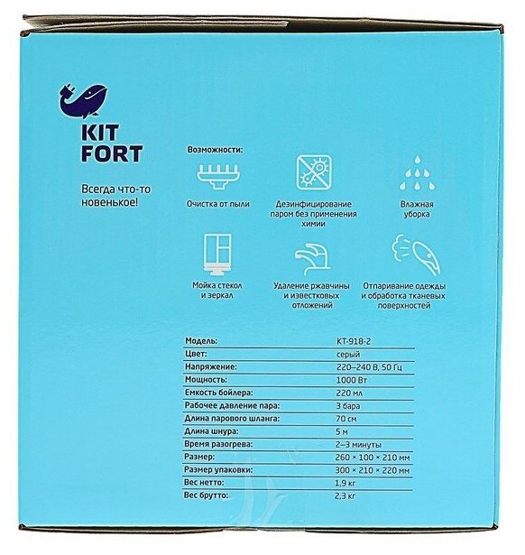 Пароочиститель Kitfort КТ-918-2, 1000 Вт, 0.22 л, 3 бара, шланг 70 см, шнур 5 м, серый интересное: