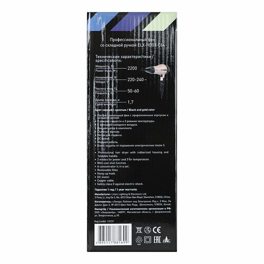 Фен со складной ручкой ELX-HD03-C64 черный/золото (2200Вт, 220-240В) ERGOLUX