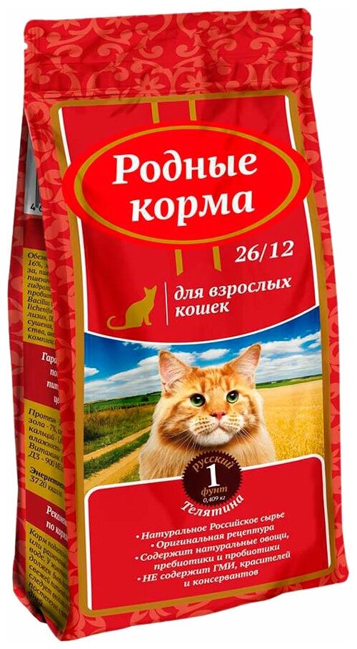 Корм сухой родные корма 26/12 1 русский фунт для взрослых кошек, с телятиной 409 г