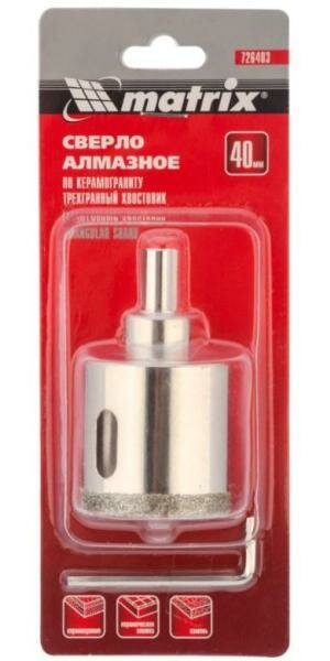 Сверло алмазное по керамограниту, 40 х 67 мм, трехгранный хвостовик 72640311 Сверло алмазное по керамограниту, 40 х 67 мм, трехгранный хвостовик MATRIX 4044996132921