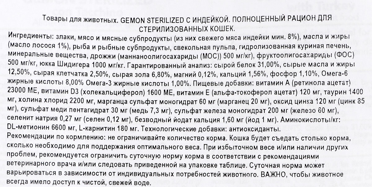 Gemon Cat Sterilised корм для стерилизованных кошек с индейкой 1,5кг 7127 .