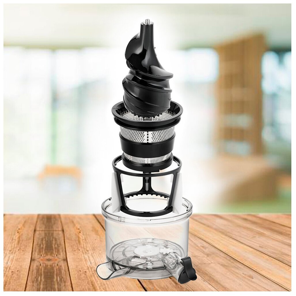 Удовольствие начинается с момента распаковки: все элементы бережно уложены и аккуратно упакованы. В наборе есть шинковка с разными ножами, три фильтра для сока и приспособление для приготовления сорбета. Для снятия проб всех разновидностей блюд, которые можно приготовить можно провести с семьей много времени. Одного большого и сочного яблока и моркови (12 см) хватило на три бокала вкуснейшего сока. Жмых практически сухой. На заметку: если в жмых от моркови добавить сахар, то через несколько минут кроме отжатого сока будет еще и аналог тертой морковки ! А это - безотходное производство практически. Достаточно тихая! Также пользуюсь центробежной соковыжималкой. Есть с чем сравнить. |