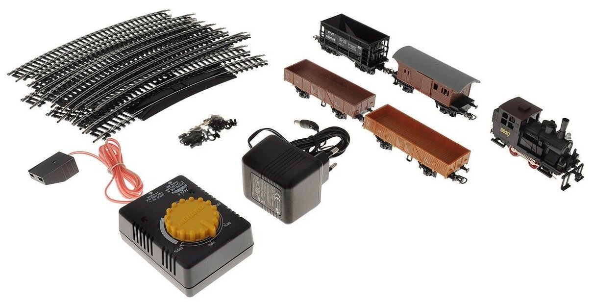| Дополнительная информация | паровоз, вагон-хоппер,2 открытых грузовых вагона, закрытый грузовой вагон, ландшафт с тоннелем, домами и постройками, растениями; ландшафт размером 125 х 100 см; размер собранного железнодорожного полотна: 117,5 x 95,5 см; возможность изменения скорости движения; |