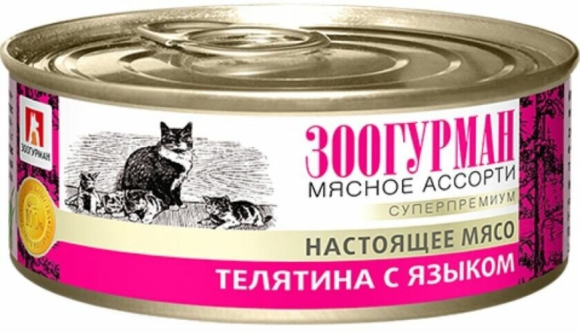 Зоогурман мясное ассорти для взрослых кошек с телятиной и языком банка NEW 100 гр х 12 шт