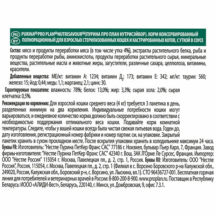 Влажный корм Pro Plan STERILISED для стерилизованных кошек и кастрированных котов, с уткой в соусе, паучи, 85г.*12шт.