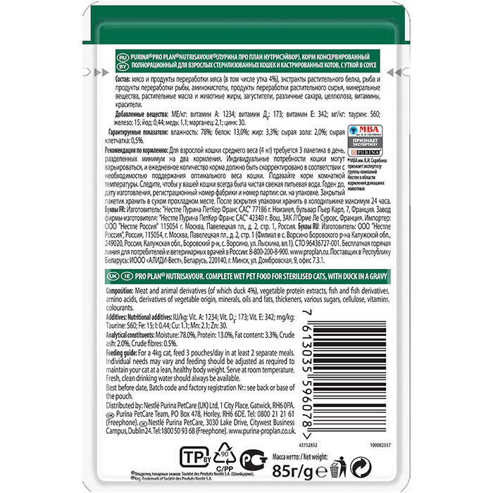 Влажный корм Pro Plan Nutri Savour для взрослых стерилизованных кошек и кастрированных котов, с уткой в соусе, Пауч, 85г