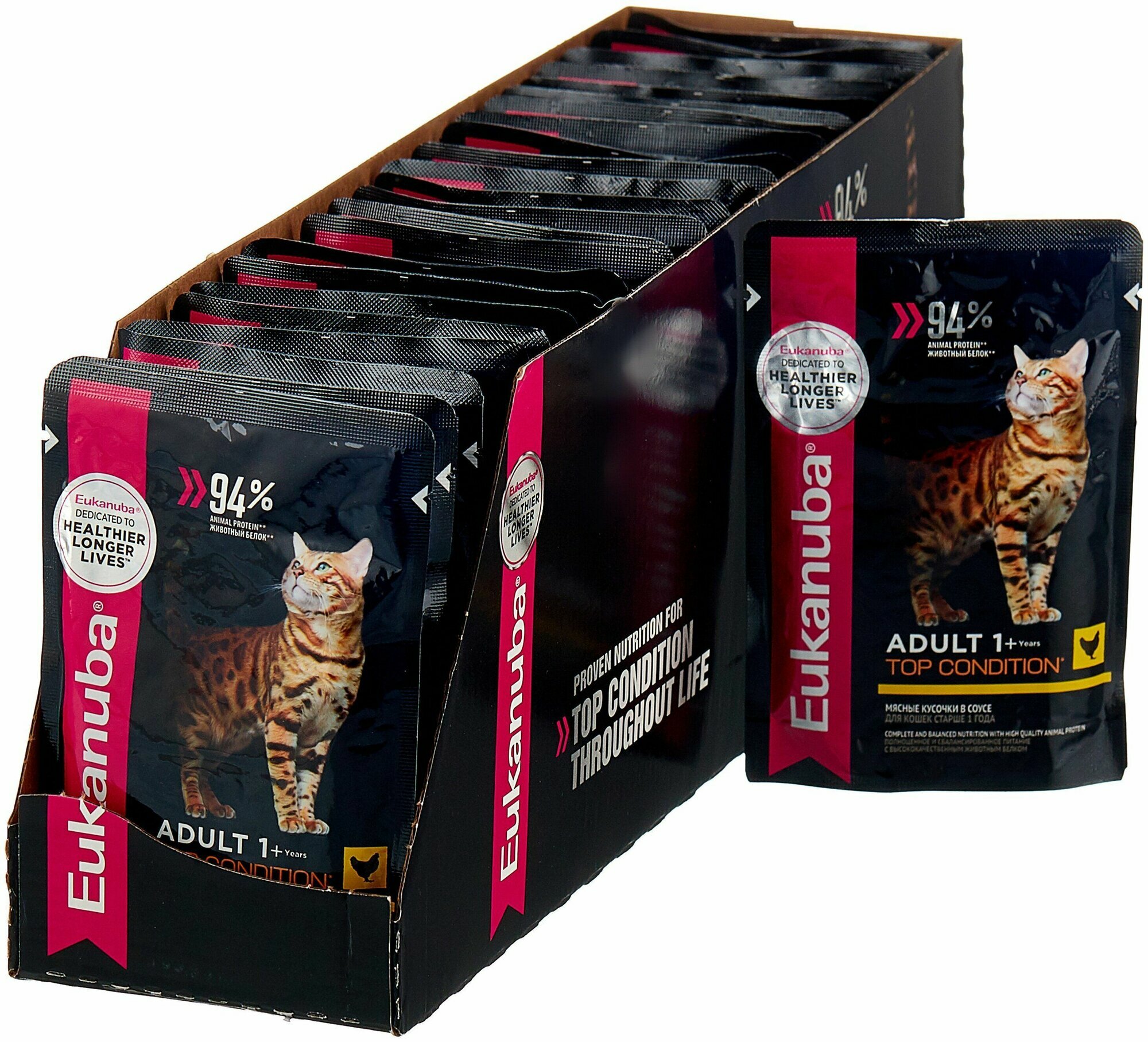 Влажный корм для кошек Eukanuba Top Condition, для здоровья кожи и блеска шерсти, с говядиной, 26 шт. х 85 г (кусочки в соусе)
