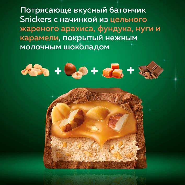 Батончик Snickers Лесной орех с арахисом, карамелью, фундуком и нугой, 81 г